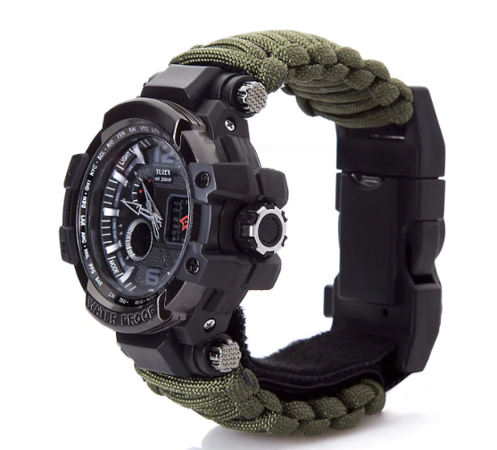 Funktioner: Kompass, termometer, eldstartare, visselpipa, LED-ljus, paracord-armband